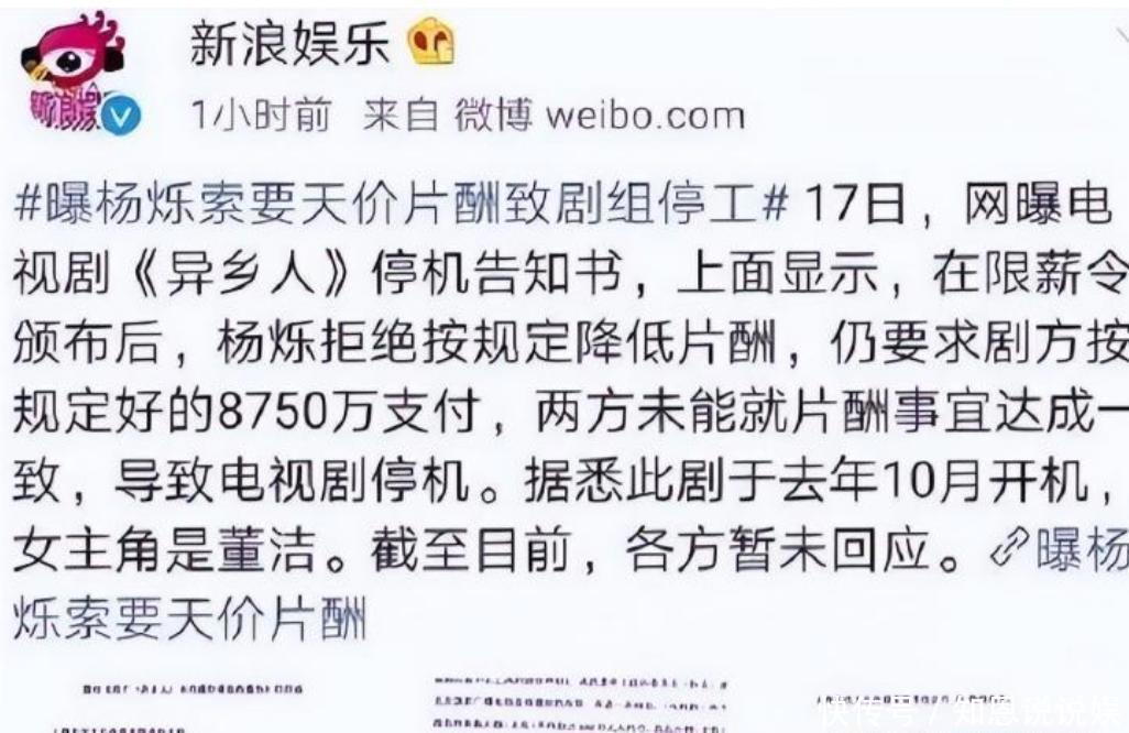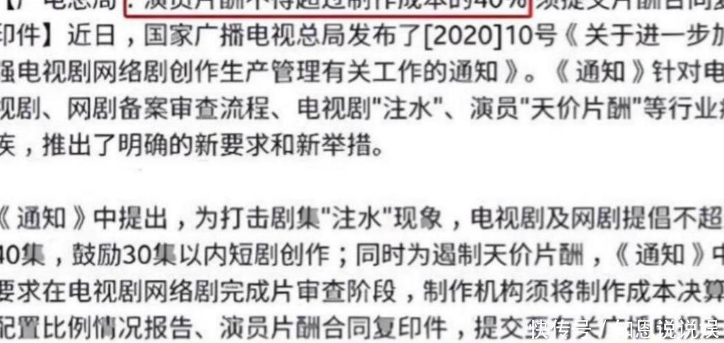 就是说不让那些大牌明星一个人把整个项目的预算都拿走了,所以很多明星都开始乖乖遵守这些规定。电视剧《异乡人》的制作方直接在网上说杨烁“不听话”,坚持按照限薪令出来前商定的8750万片酬去支付。